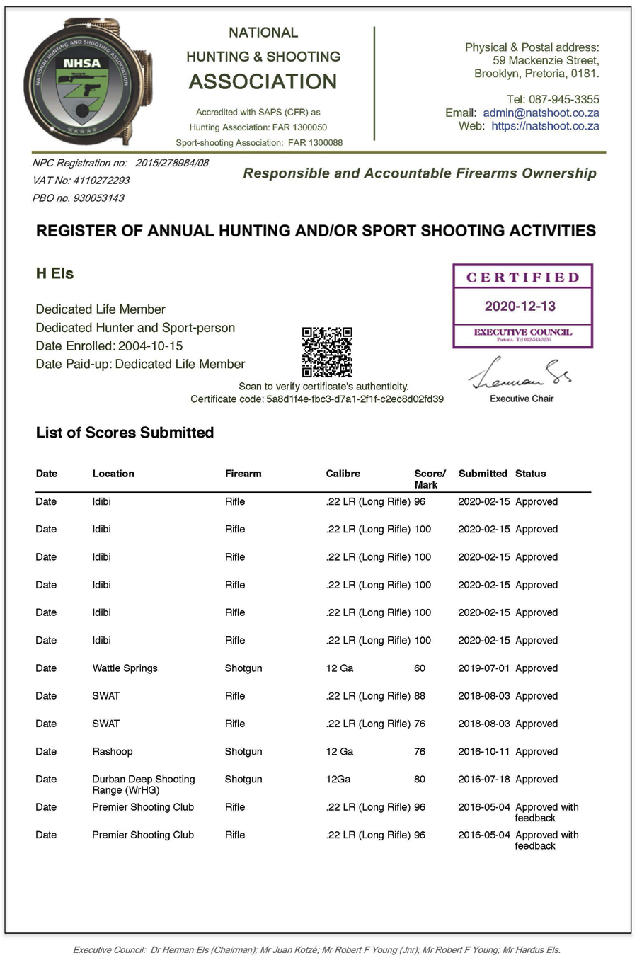 2. A member’s official NHSA Activities & Scores Report is a valuable document to attach to all licence applications (new licence or renewal) as it shows SAPS your record of participation.