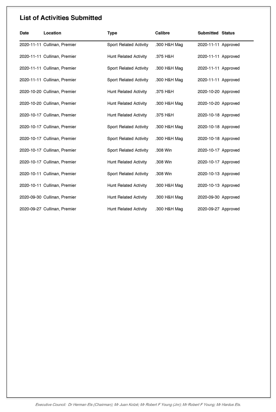 3. All activity entries MUST please be accompanied by confirmation documents. Confirmation documents must contain a member’s Initials and Surname, ID number, and the place and date of the activity. Confirmation documents can be a receipt with the date of the activity on it, or a letter from an accompanying friend stating that s/he vouches for the activity having been conducted on that specific day, or the date & name written on a practice target, or any confirmation of days indicated for the duration of a hunting trip.