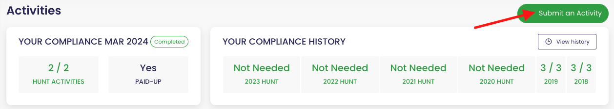 2. Dedicated Hunter – The Page must show at least TWO Approved hunting Activities