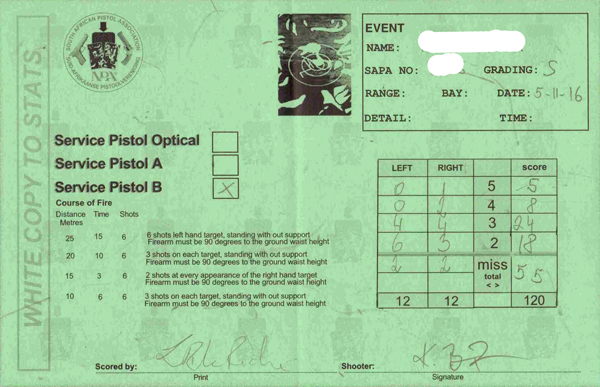 COURSE OF FIRE: Total of 5 shots at 8m – shot on your own time, on one target and scored out of 50 points.